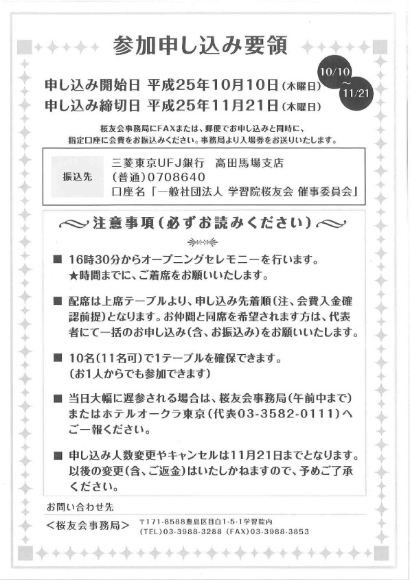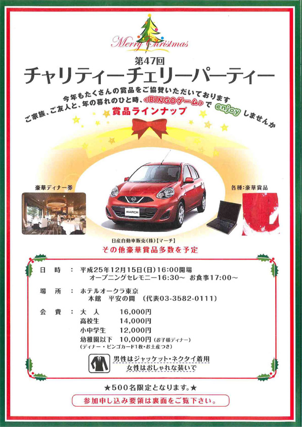 2013.09.10 本部行事:卒業生催事・イベント #催事 2013年チャリティチェリーパーティのご案内 今年もまた、チェリーパーティの季節が近づいて参りました。本年は12月15日(日)に開催となっております。詳しくは、パンフレットの画像をご覧下さい。尚、下段にお申し込み書をダウンロード出来るようになっております。お申し込みはファックスでおねがい致します。 お申し込み書は下のアイコンをクリックしてダウンロードして下さい。