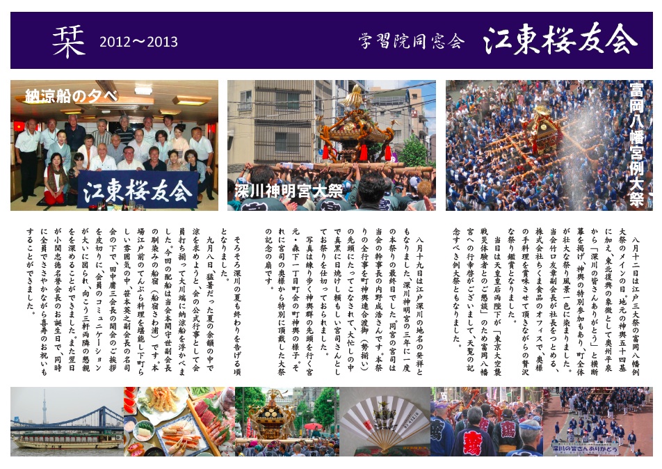 平成25年6月23日 波多野敬雄 学習院院長、秋山 豪 桜友会副会長のご臨席を賜り、また東京6支部代表者もお迎えし、第17回 江東桜友会 総会、落語会、懇親会を開催いたしました。