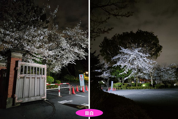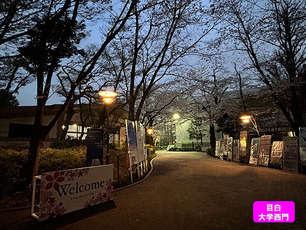 4/4目白の西門にて撮影、「今年は咲くのが遅かったですが、目白に行ったら、大学の夜桜が見れました。新歓の看板がずらりと並び、入学式からの学生の活気も感じました。」・・・島村玲美・平13哲