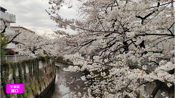 4/4文京区・関口附近「細川庭園・椿山荘近くの神田川で。今年は開花が遅かったせいか、五分咲き程度なのに所々葉っぱが見られました。」・・・中野薫樹(昭60済)