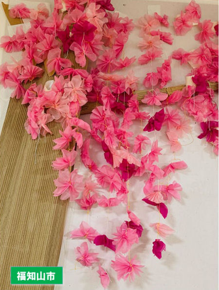 福知山市の通所リハビリテーションセンターで70人の利用者と職員で1週間かけて一緒に作った1メートルの高さの枝垂れ桜です。施設中央に飾られた色鮮やかなピンクの枝垂れ桜をみているとリハビリ頑張ろうという意欲が沸々と湧いて来ます。「美しい枝垂れ桜が背中押す」・・・山口秀樹(昭60営)