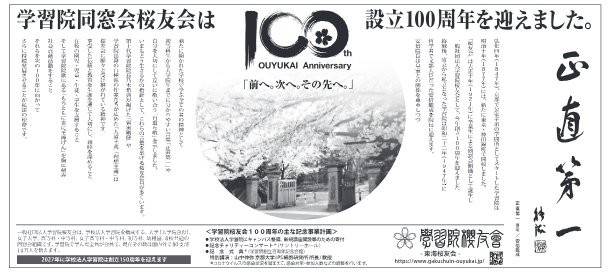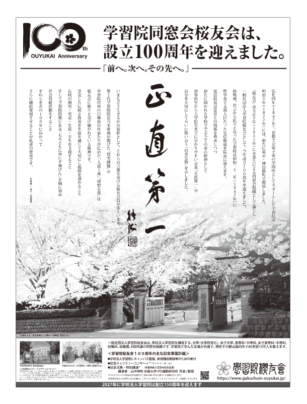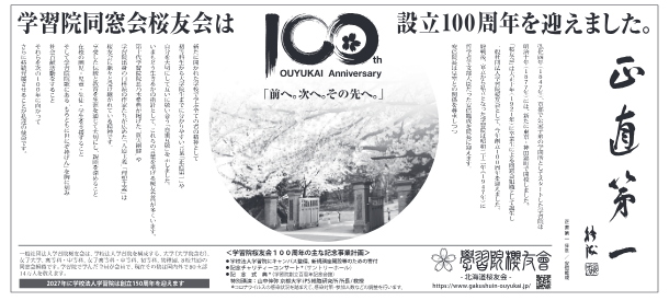 今回の新聞広告では、第18代学習院院長の安倍能成先生揮毫の「正直第一」を大きく掲載しています。今の世の中に改めて大切な言葉であると認識し、様々な時代を学習院で過ごした、様々な年代の桜友会会員に、母校の歴史や伝統などを共通認識として自覚し、今後の支部活動の際にこの「新聞広告」をご活用いただければ幸いです。