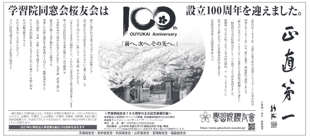 100周年を祝う会員の連帯意識のシンボルとなる新聞広告は、伝統・校風、そこで育まれた卒業生たちの活動を、広く社会の新聞読者、そしてそこからの広がり、に理解いただくことで「学習院」と「いずれ社会の一員に加わる在学生」を支援する活動となることと思います。