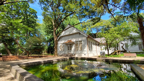 北別館です。夏の青空と木々の緑と北別館の色合いが綺麗でした。水面にも木々や青空が少し写っています。8/19撮影
