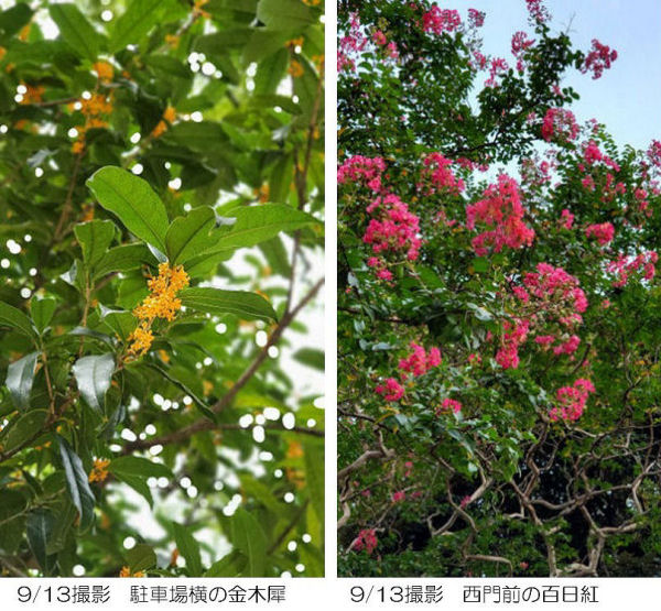 9/13撮影 駐車場横からの金木犀と創立百周年記念会館