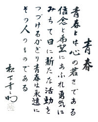 最後に、「青春とは心の若さである 信念と希望にあふれ勇気にみちて 日に新たな活動を続けるかぎり 青春は永遠にその人のものである (松下幸之助)」という京都政経塾卒塾記念にいただいた詩と「常に志を抱きつつ懸命に為すべきことを為すならば、いかなる困難に出会うとも道は必ず開けてくる。成功の要諦は、成功するまで続けるところにある。」という松下政経塾の素志貫徹の教えを我が胸に、今一度深く刻みたい。
