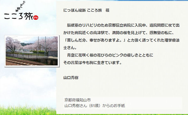 インタビューで私がお伝えしたかったことのひとつは、脳梗塞の回復期に入院していた綾部市の京都協立病院のホスピタリティをベースとしたチーム医療の素晴らしさである。転院後もベッドサイドでの生活が主だった私が、医師・言語聴覚士・管理栄養士さんのチーム力で鼻から食道に固定したチューブからの経管栄養を脱して口から食事出来るようになったり、看護士・理学療法士・作業療法士・介護福祉士さんのチーム力で片杖歩行や入浴が出来るようになったり、退院→自宅生活→職場復帰・定年退職→夢を語る歌人・エッセイストとしてのセカンドライフに歩みを進められたのはこの病院の医療従事者の皆様のおかげである。