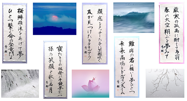 | 奈良県五條市立五條中学校教諭時代に担任をした世界的な風景写真家の片岡司さん。 文化財の修復にも活躍している希少な丹後和紙に、障害があったり病気であったりと生きづらさを抱える十色の夢のカタチ・喜びと悲しみの物語を短歌に詠み、彼の一服のアートのような風景写真の色に重ねました。令和7年4月から6月に大江町和紙伝承館、令和7年6月空海生誕記念日に高野山真言宗総本山金剛峯寺別殿で二人展をしました。国内は元よりアメリカ、フランス等諸外国の方々にご覧いただけたのは望外の喜びでした。 短歌は山口、写真は片岡司さんです。 |
