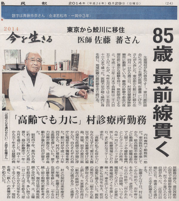 生涯現役が私の信念です—東白川郡医師会に今月(平成26年6月)、85歳の医師、佐藤蕃(しげる)さんが入会した。東京都から鮫川村(福島県東白川郡)に移り住み、4月1日から週3日、村国民健康保険診療所に勤務している。・・・・・・佐藤 蕃先生(昭24旧高卒・東京医大卒・医歯薬桜友会会員)