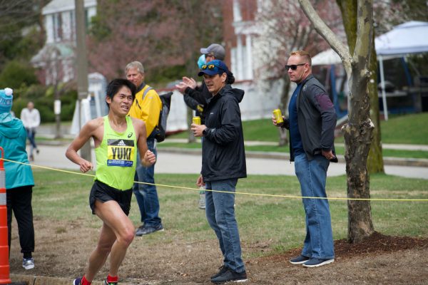 4月15日のマラソン当日は朝から雷雨で不安定な天気でしたが、レースの頃には日が射し湿度も高く、川内選手には少し厳しいレースとなりました。しかし、沿道ではゼッケン1の『YUKI』への声援は一番大きかったのではと思えるほどで、苦しいながらも最後まで力を振り絞ってゴールした姿は感動に値するものでした。