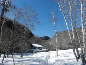 青い空の中で雪に埋もれた日光光徳小屋。。。清々しい風景です。