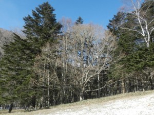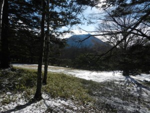 11日。斜面のササは緑のままに、森の木々の額の中に男体山が収まります。
