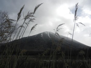 男体山の真上の空はくもり、そよぐヨシに冷たい風が感じられ、雪は無くても真冬の戦場ヶ原。