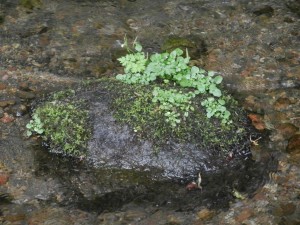 小川の中の石の上では、苔むした部分の陣取りが始まっています。