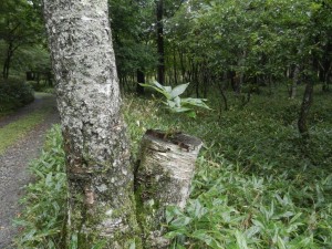 シラカンバの切株に根を下ろしたササは、白い植木鉢に体よく収まり、ご機嫌な様子。