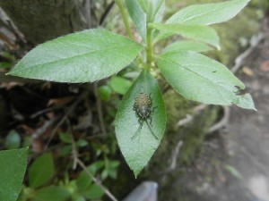 「きみはだあれ?」葉っぱの上にでん!と構えた虫君。