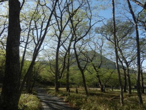 1日。ミズナラやハルニレの遅い芽吹きの淡い緑と空の青の中に木々の黒いシルエットが美しく、後には、まだまだ男体山が透けて見えます。