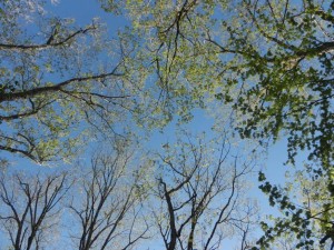空を見上げると、まだ木々の新葉はまばらに絵を描いていますが、緑が空を埋めつくすのもあっという間です。