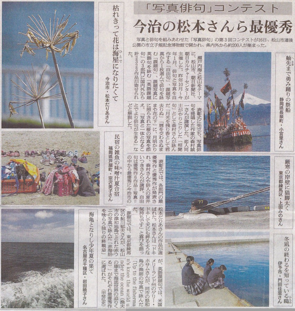この度、俳句の街・松山道後を会場に開催された「第3回写真俳句コンテスト」に応募したところ、目出度く最優秀賞を受賞されました。(新聞コピー参照)