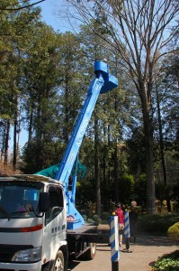 この度、観楓苑(自宅)のケヤキの大枝を伐採することになり、大型クレーン車と高所作業車がやって来て空中ショーを展開しました。