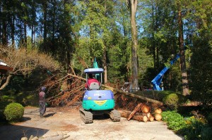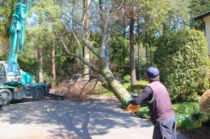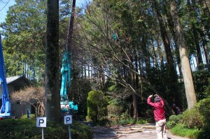 クレーンで吊るしながら、幹の途中で胴切りするのです。