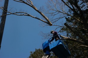 作業員はワイヤーを確認してチェンソーで枝を切るのです。
