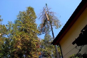 加えて枯れたヒノキの伐採は胴体の吊るし切り。