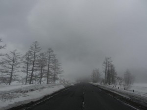 中禅寺湖を過ぎてやや晴れてきたものの国道は霧に煙り、山々は見えません。