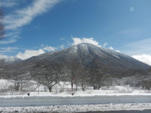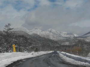 と、振り返ると国道の向こうには三ッ岳が寒々しい風景に埋もれていました。