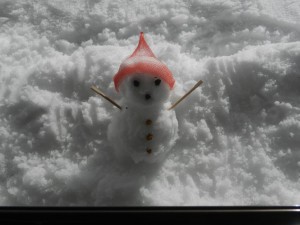 管理棟の窓を覆い隠そうとした雪で窓から雪だるまを作ってみました。