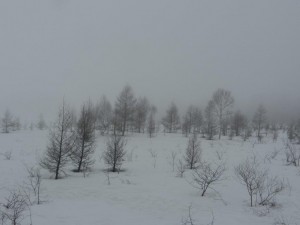 霧に包まれた雪原状態の戦場ヶ原では、木々のシルエットが可愛くかすんでおりました。