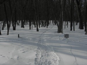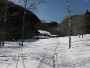 小屋への小道は雪原の中に出来たスノーシューのトレースです。