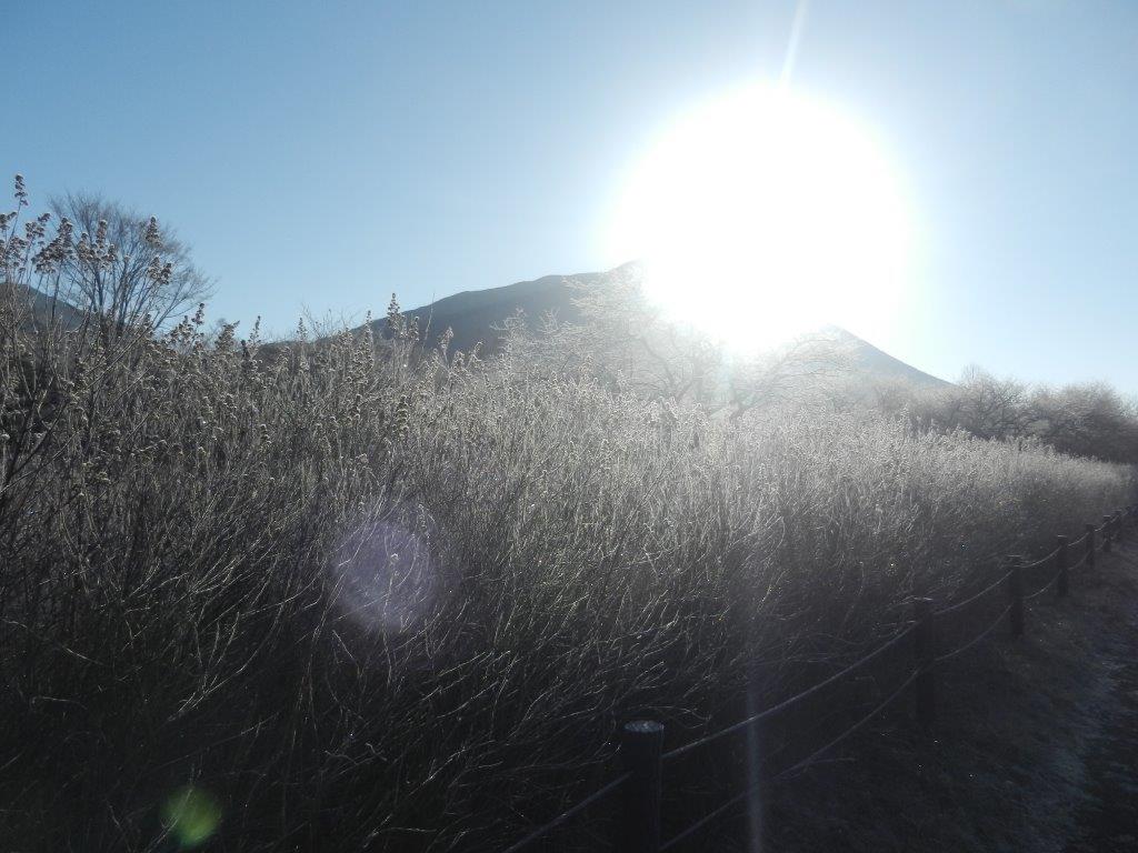 ホザキシモツケやズミに降る霜は朝日を受けて輝きます。