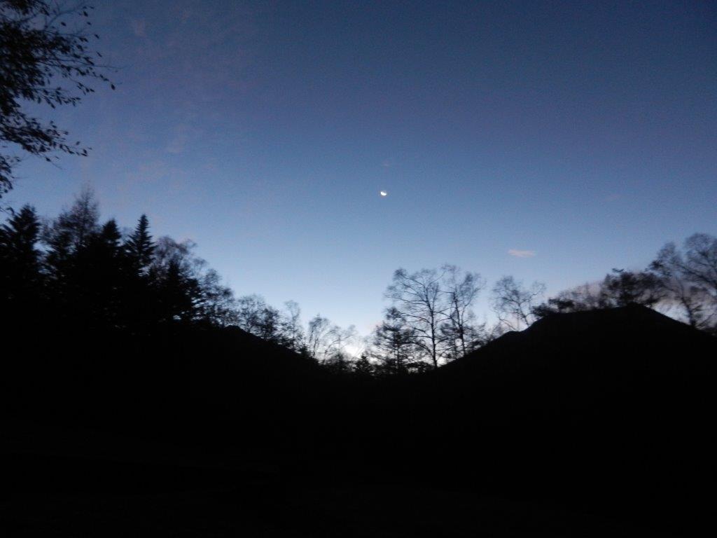 さて、11月1日、日没前の空に月が、美しい青の中にポイントを落として。。。