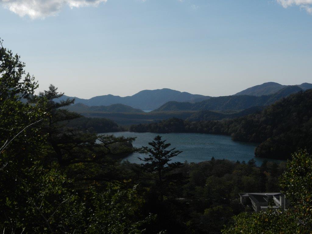 金精道路から湯ノ湖を臨み、「中禅寺湖が見える?」との問いに「違うと思う」と答えた私。