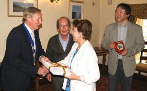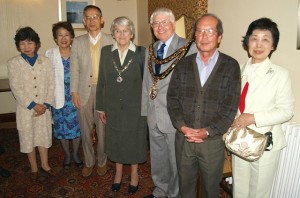 上の写真はカーデイガン町長と野村(旧姓 辻村)苑子さん(昭43哲卒)とウイスキー評論家土屋守さん(昭54国文卒)との記念品交換式の様子です。