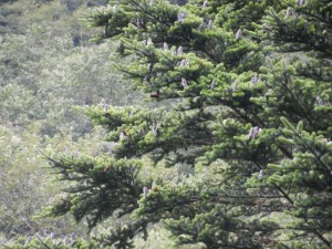 小川向こうのウラジロモミには今年も紫の松ぼっくりが