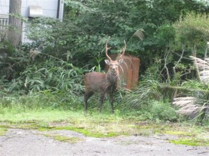 2011.09.15 全国支部:栃木桜友会 霧降ハウスに牡鹿 S37卒の鍋谷 汎・千賀子です。霧降のセカンドハウスには、千客万来。親戚・友人のほか、野生の動物諸氏も多数です。前回はキジ君の訪問をご報告しましたが、今回は「牡鹿」君の訪問です。子鹿のバンビも成長して、森の王様に・・・この鹿は、私のハウスを建てる前は、その場所が自分達の「愛の巣」であった?ようで毎年のように現れます。この写真は去る9月7日に横浜在住の後輩がやって来た際、ハウスのすぐ前に角の大きくなった牡鹿が現れ、後輩を驚かせた時のものです。 思い出の「愛の巣」に訪れた牡鹿堂々とした「森の王者」の貫禄