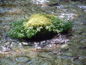 小川の苔むした石は、周りをネコノメソウが取り囲み今にも水の中から緑のカッパが出て来そう。。。