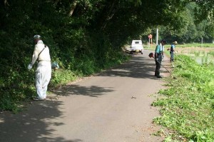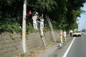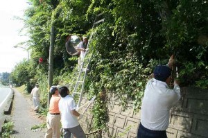 2010.08.08 全国支部:栃木桜友会 夏の地域活動に参加 真岡市在住の上野(S40政)です。田舎で生まれ育ち、学生時代だけの東京生活でした。田舎道には木の小枝が茂り、視界が悪くなって危険です。そこで、昔からお盆前に「小枝刈り(こさがり)」をするのが習慣となっています。今年は8月8日に地域住民総出で小枝刈りを実施。刈り払い機の活躍ですっかりきれいになりました。小枝には蜂の巣があるので油断すると刺されますが、小型のアシナガバチの仲間なのでさほど危険はありません。同時にカーブミラー周辺の小枝も刈り払い、視界を確保しました。