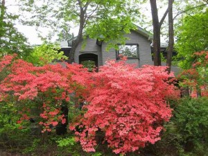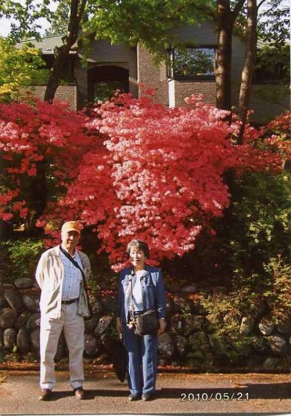 折から山ツツジは満開。燃えるような花の前でのツーショトです。
