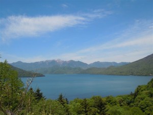 空の青、白い雲、木々の新緑。。。背景の山の青緑。