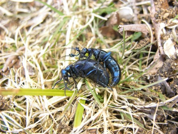 青く光るツチハンミョウ。陽射しに誘われあちこちに出没。