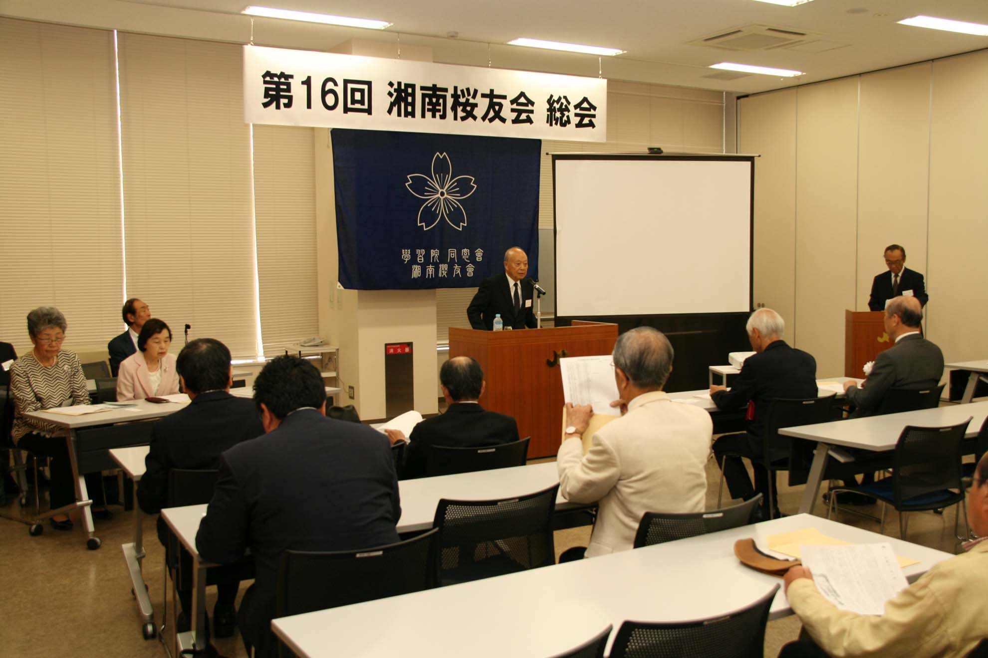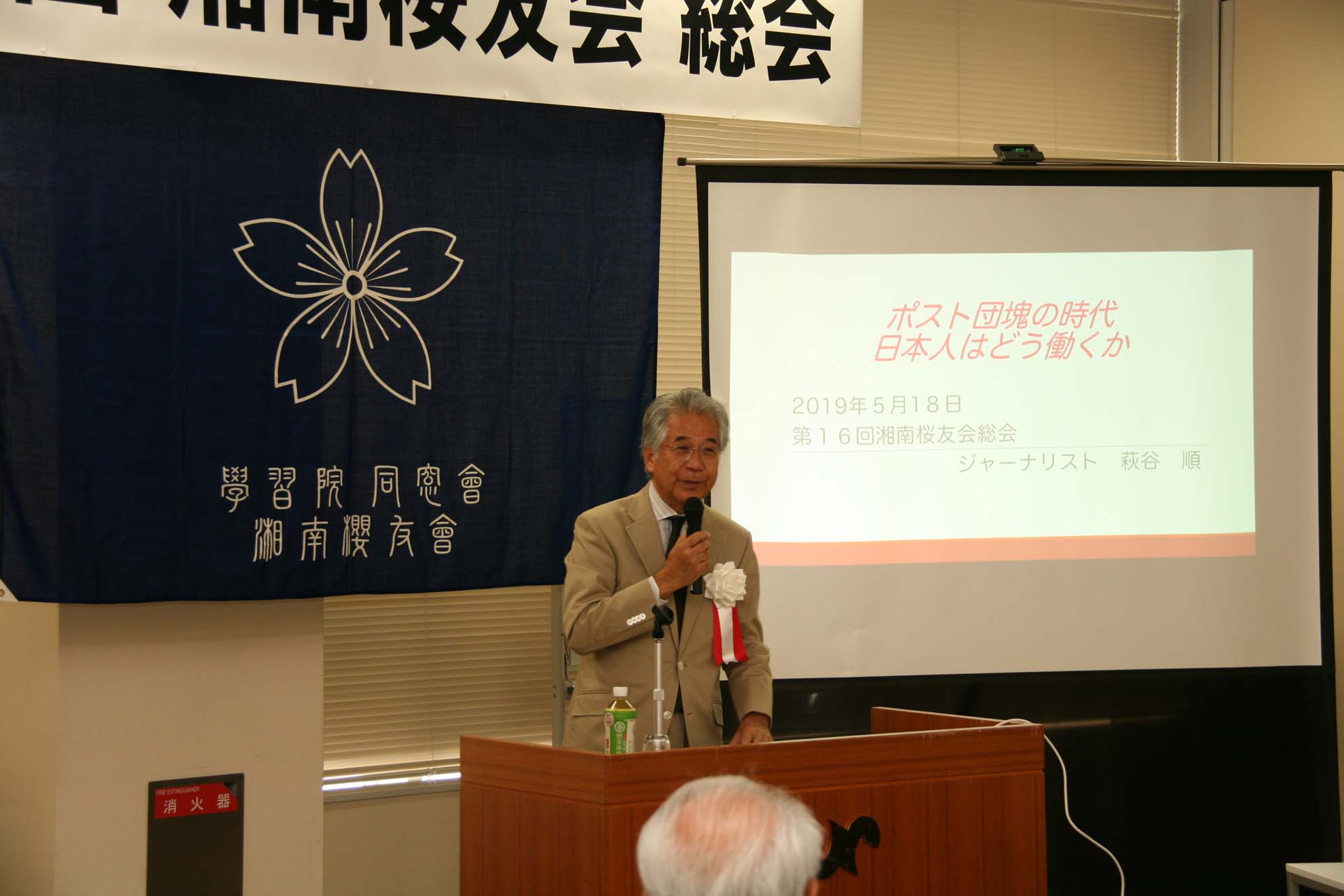 2019.06.12 全国支部:湘南桜友会 第16回総会・懇親会開催 第16回総会・懇親会開催 第16回総会は、5月18日、夏模様の好天の中、ご来賓を含め 57 名のご出席で開催されました。総会に引続き行われました講演は、学習院高等科 から東大へ進まれたジャーナリストの萩谷順様にご出演頂きました。演題は、「ポスト団塊の時代 日本人はどう働くか」と題し、世界を取り巻く社会構造の変化、少子高齢化社会の成熟等の中、働き方改革を推し進め GDP の向上を図るべきとのご提案を頂きました。続いての懇談会では、9 名の新入会員のうち4名のご参加をいただき、和やかな中にも活発な情報交換が続き、新旧会員の懇親をはかる事が出来ました。いつまでも話の尽きない中、お開きとなりました。