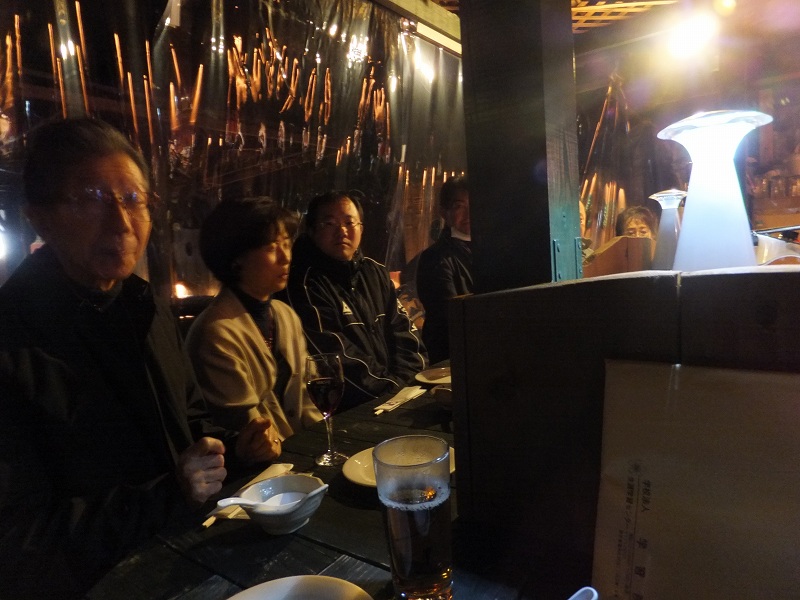 2012.12.03 全国支部:山梨桜友会 平成24年11月例会 平成24年11月28日に要害温泉「ビアテラス」冬バージョン特設屋台にて本年最後の例会を開催しました。月末のため10名と屋台の大将の計11名の楽しい例会になりました。本会幹事で要害温泉オーナーの山本さんがカウンター内で屋台風に料理を手際よく出してくれていつもと違った味わいができました。煮物、焼き物、揚げ物もその場で調理してすぐに手元にまさしく屋台の醍醐味を味わいました。カウンターの周りも厚いビニールで囲ってストーブだけでも十分暖かく快適でした。日中のコンペの疲れも甲府の夜景を眺めながらの露天ブロで癒されて最高の一日でした。
