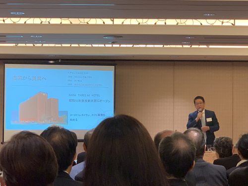 2019年10月10日(木)18時より霞会館にて行われました桜友会の月例会で、我が関西桜友会の畑中世話人が講演されました。関西桜友会からも北河原会長を始め約10名が応援に東京まで行って参りました。初めて霞会館に足を踏み入れる人も多く、少々緊張の中桜友会本部の月例会を体験してまいりました。畑中先輩の同級生やクラブのお仲間たちも多数いらっしゃり、参加者は100名を超える大盛況でした。また、普段よりスーツ姿の男性がかなり多かったようで、畑中先輩の影響力の強さを感じました。学習院での学生時代の頃の様子から就職され証券会社で鍛えられ、その後自ら会社を立ち上げてこられた大変興味深いお話しを流暢にお話しされていらっしゃいました。演題の『そして、奈良・・・』の奈良とのご縁、奈良の素晴らしさ、これからの奈良のさらなる偉大な魅力についてお話し下さいました。私共幹事も本部桜友会月例会に参加でき、大変良い経験をさせて頂きました。