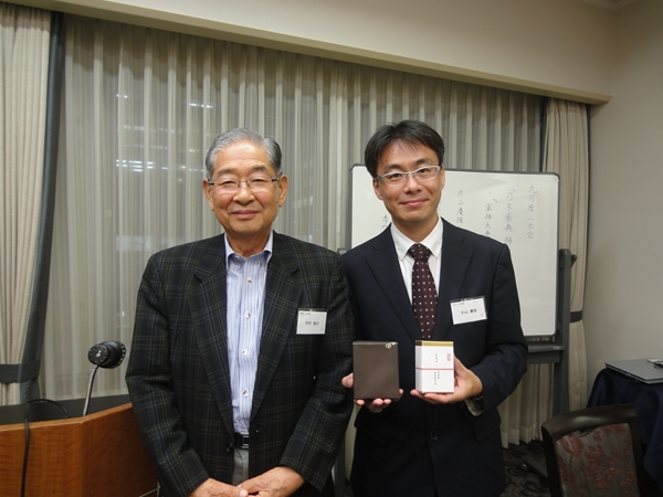 本年7月度の講師・河村敏介氏から片山慶隆氏(写真右)に記念品の贈呈