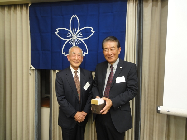 荒西義昭氏(昭和33年大政経)から講師の佐々木氏(右)へ記念品の贈呈