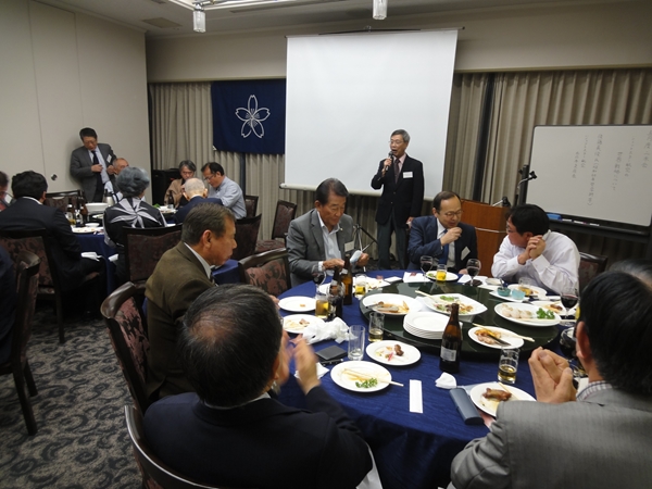 今回は、成蹊大学OBの3名様がご出席(ご起立の男性、左から角原充様、南雲守様、綿貫道彦様)。