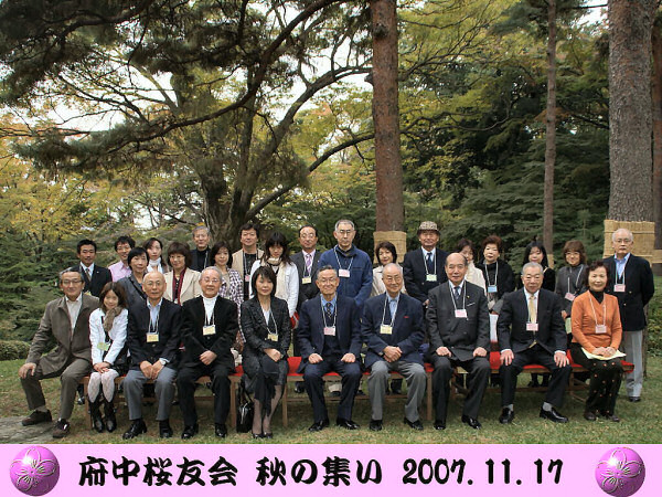平成19年11月17日「秋の集い」を催しました。府中桜友会の日江井会長、ご来賓の桜友会亀井名誉会長からご挨拶の後、記念撮影、すばらしい園内の散策、懇親会、抽選会と参加者の皆様で大いに楽しみました。また野口府中市長(府中桜友会顧問)のリードにより全員で院歌を合唱するなど非常に盛会でした。